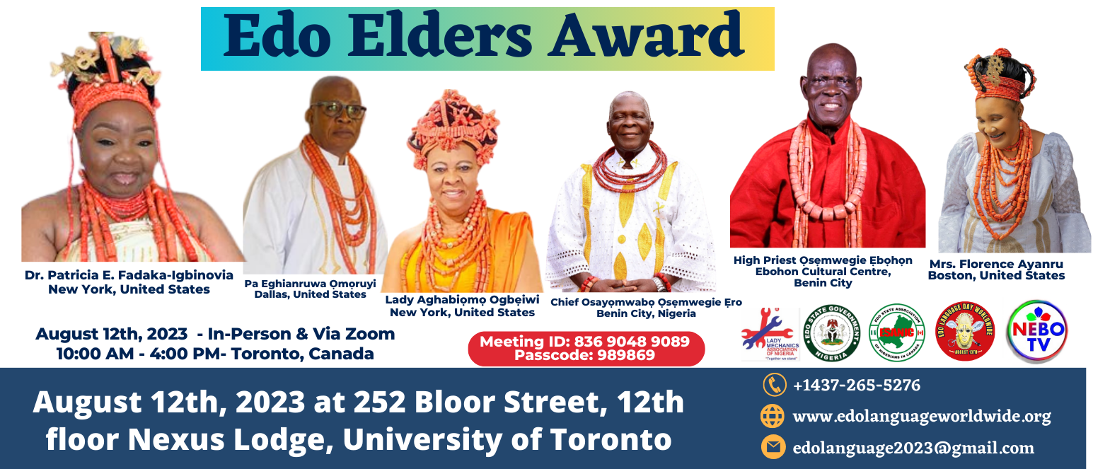 We have incorporated Edo Elders Award into the Edo Language Day program with a maximum of six nominees annually. The award program is geared towards recognizing and honouring Edo Elders, who have contributed immensely to the development of the Arts, Culture and Civilization of the Great Benin Kingdom. As part of this year’s program, the Edo Lanugauge Day Organizing Committee has selected six Edo Elders and one posthumous award recipient for the 2023 Edo Language Day Worldwide program. These preeminent Edo Elders would attend the award ceremony at the Edo Language Day program in Toronto on August 12th. The nominated Elders in Nigeria will receive the award in Benin City on August 12th.