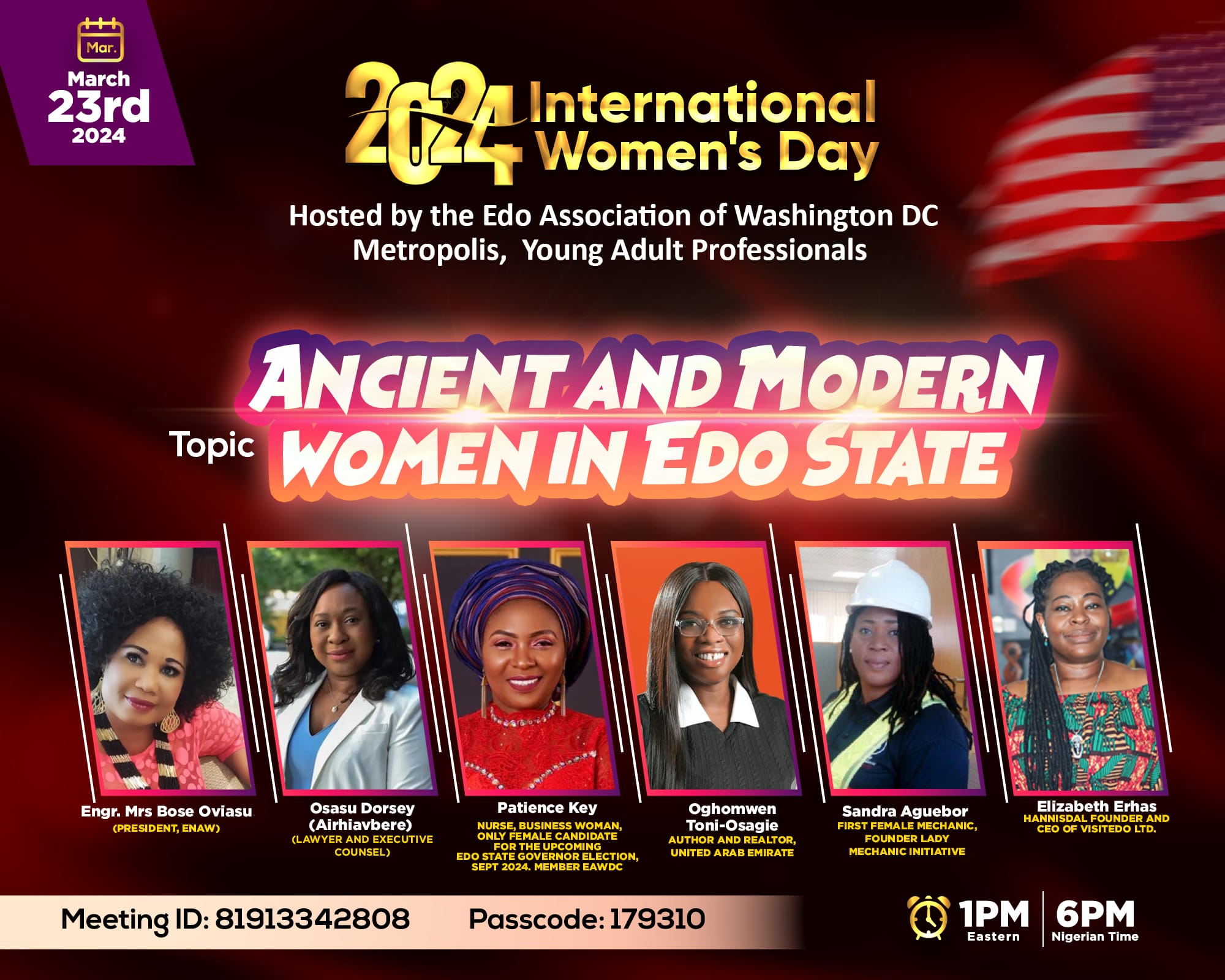 The 2024 International Women’s Day event is coming up on March 23, 2024 online via Zoom. The event aims to highlight the contribution of Ancient and Modern Edo Women to the development of Edo State. Join Zoom Meeting https://us02web.zoom.us/j/81913342808?pwd=REhZSlRvTEZYTXExK200ZnY0QitZZz09 Meeting ID: 819 1334 2808 Passcode: 179310