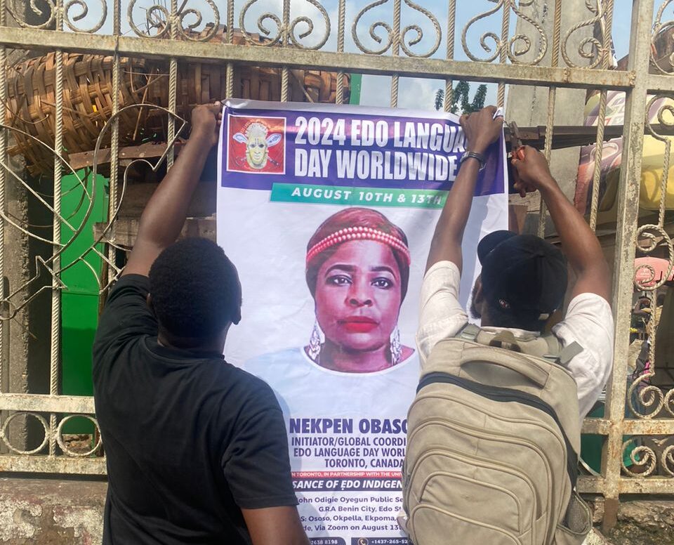 All Edo sons and daughters, including friends of Edo, are invited to join us to celebrate one of the oldest Indigenous languages in the world, Edo Language Day Worldwide! August 10th, 2024 is the in-person event worldwide! On July 6th, 2024 Amienye Omorogie and two other media persons to promotion the upcoming Edo Language Day Worldwide event in Benin City. The posters with the pictures of Nekpen Obasogie (Global Coordinator) were disseminated across the heart of Benin City.