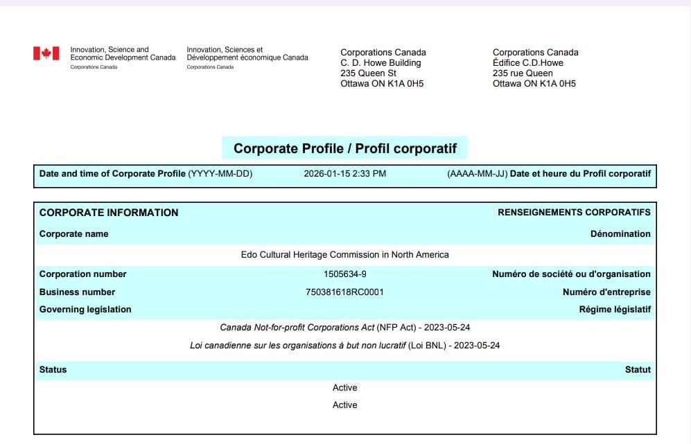 Our passion for Benin/Edo culture and art inspired us to establish the Edo Cultural Heritage Commission in North America. This significant initiative will facilitate a range of programs and collaborative partnerships within the dynamic art sectors of Canada, the United States, and Nigeria. These efforts will promote cross-cultural exchange and enhance the cultural heritage of Edo people worldwide.